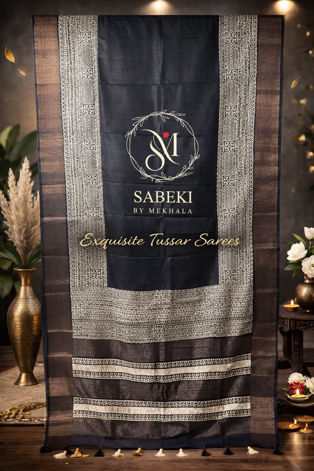 This saree is a truly smart choice for a polished corporate look. The monochrome palette, adorned with subtle script motifs, blends seamlessly with the rich texture of tussar silk to create a contemporary statement. The handblock-printed scripts add a sleek and sharp character, enhancing its modern appeal.