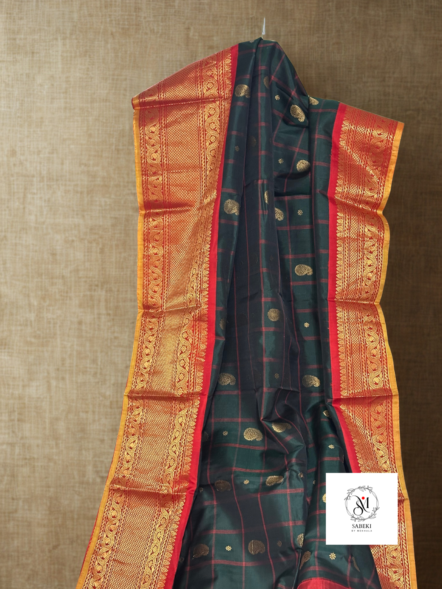 Experience the allure of traditional craftsmanship with this exquisite handwoven silk Gadwal. Featuring a vibrant Dark-Green foundation complemented by a Red border and palla, this saree showcases the timeless elegance of zari embellishments. The sophisticated color combination creates a sophisticated aesthetic, perfect for those who appreciate refined artistry and authentic textile heritage.