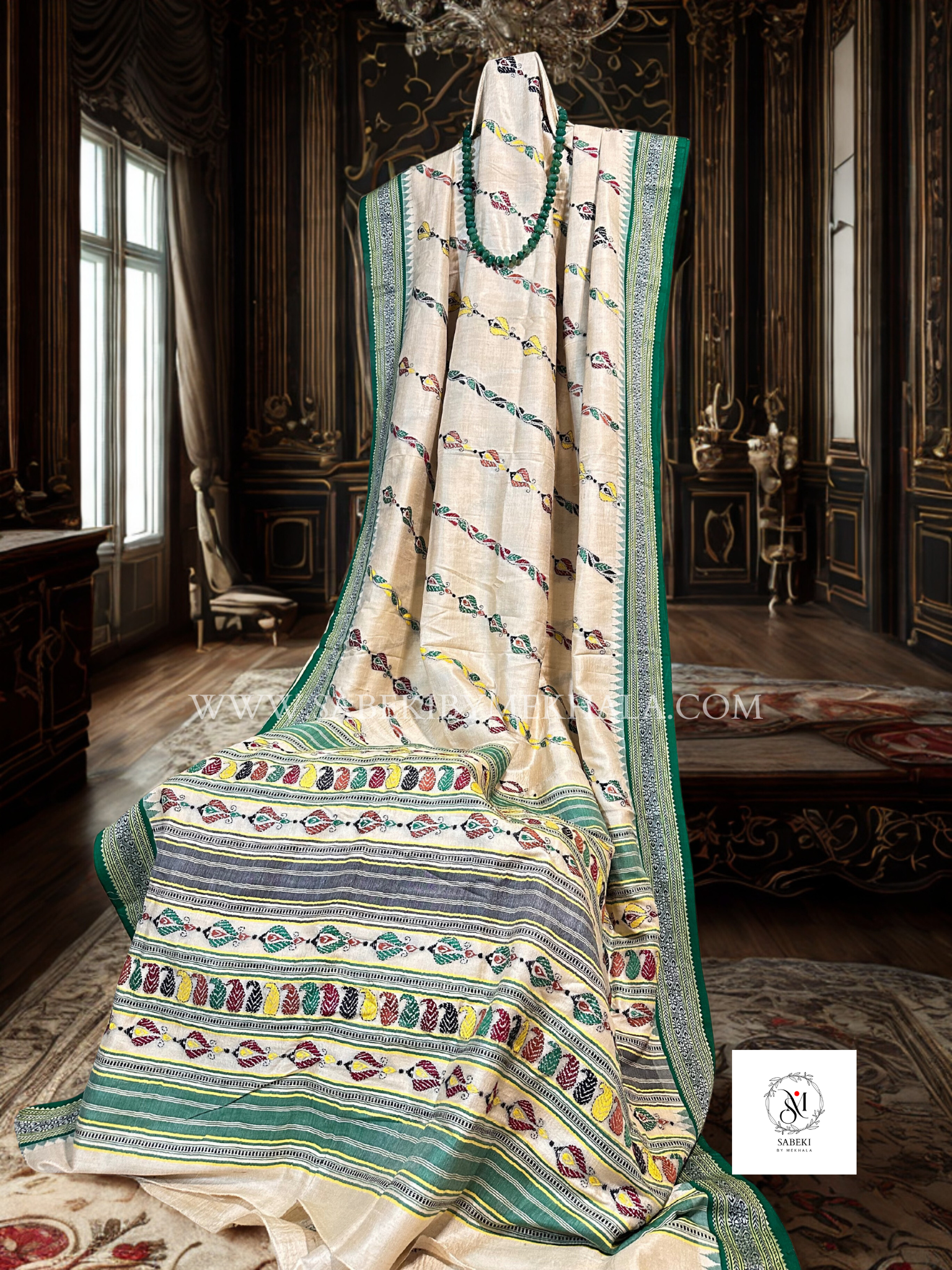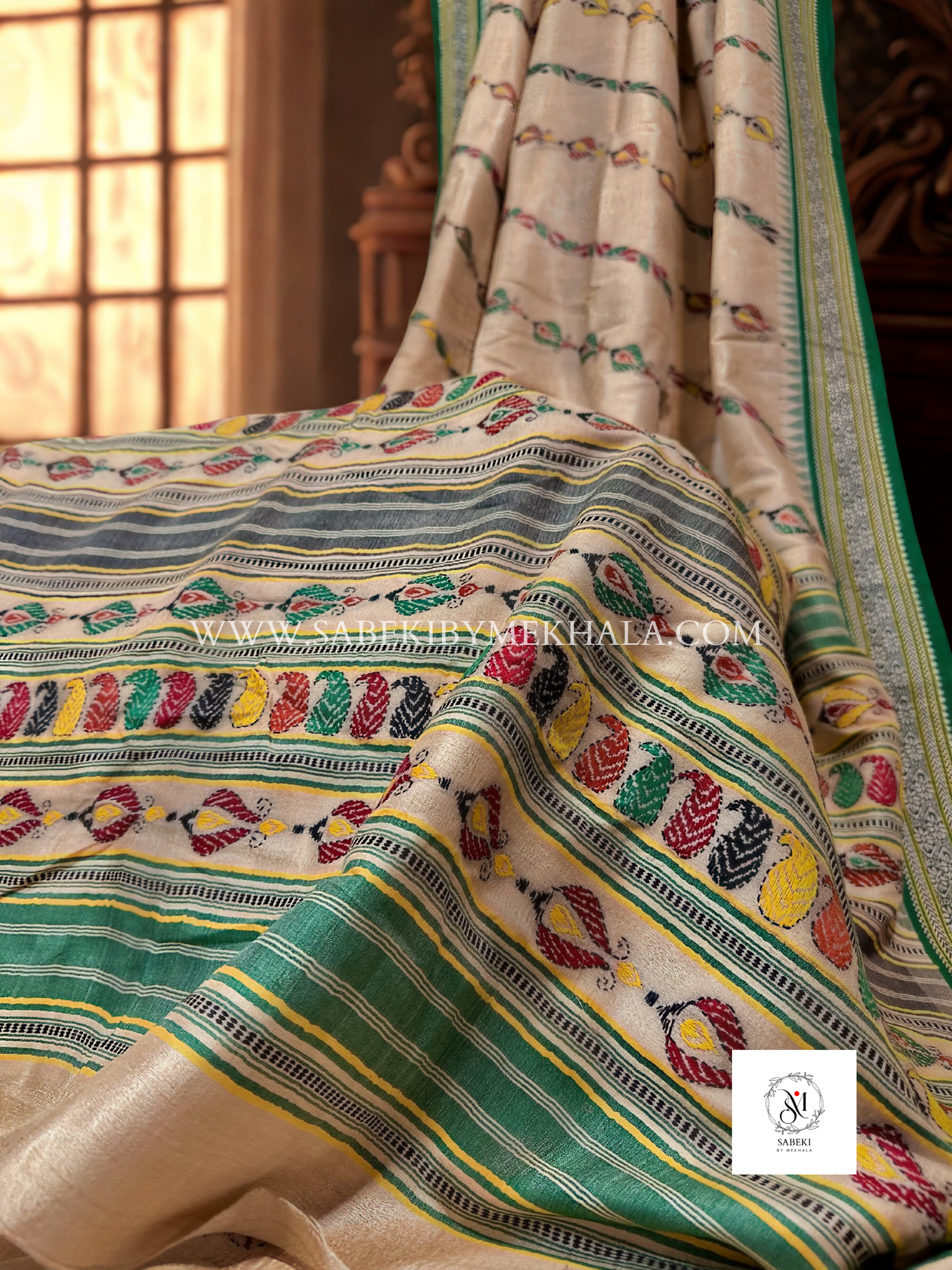Vidarbha Tussar Kantha in green thread Ada Jangla Design