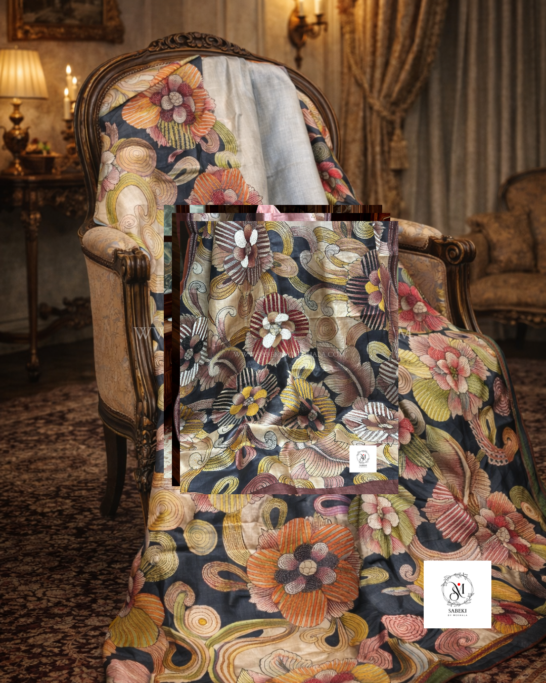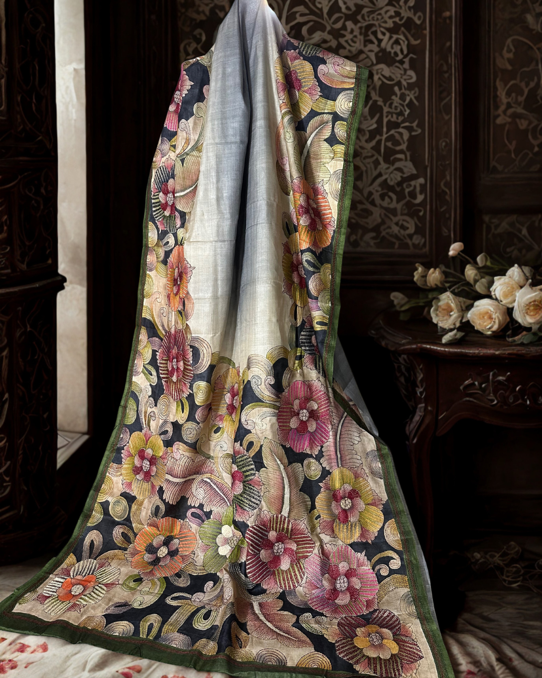 Discover an exceptional tussar kantha that seamlessly blends artisanal craftsmanship with refined elegance. Each piece features meticulously hand-painted designs layered with traditional kantha stitching, creating a sophisticated textile that transcends ordinary wear. The carefully curated color palette and premium dye work elevate this garment into a timeless wardrobe investment. A truly distinguished piece that commands attention and reflects impeccable taste.