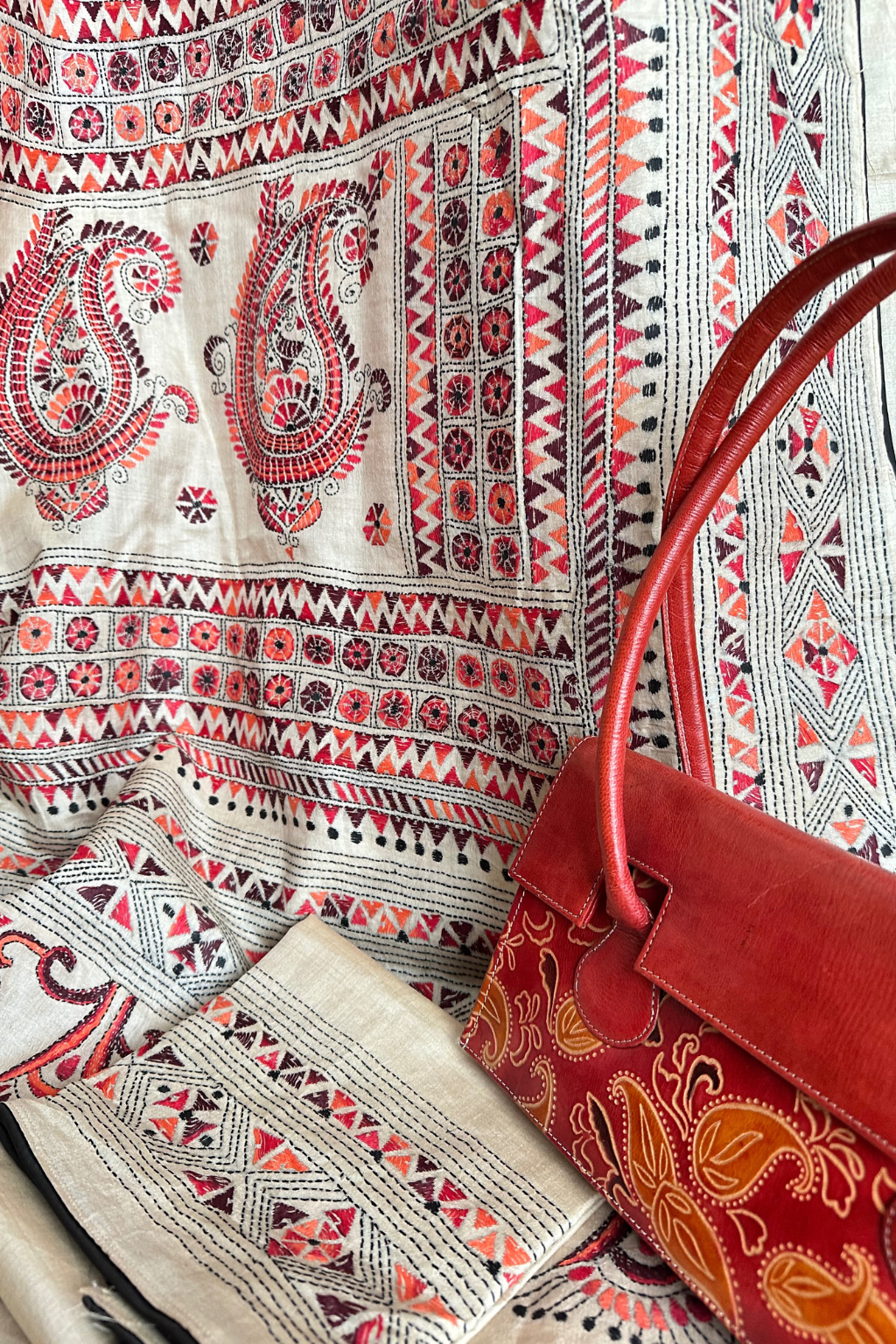 A sophisticated and rare meenakari Baluchari Kantha done on Gachi by Gachi Tussar. This one of a kind kantha tries to replicate the sense of a baluchari through the intricate paisley.