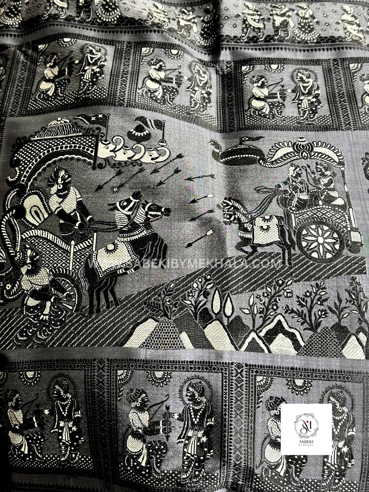 This revival Baluchari base color is very unusual steel gray with all meenakari work. Hand weaved and looks like a painting. The central panel of the Pallu reveals the story of 17th Day of Kurukshetra war where Karna was killed. The loom becomes a storyteller and history rises.