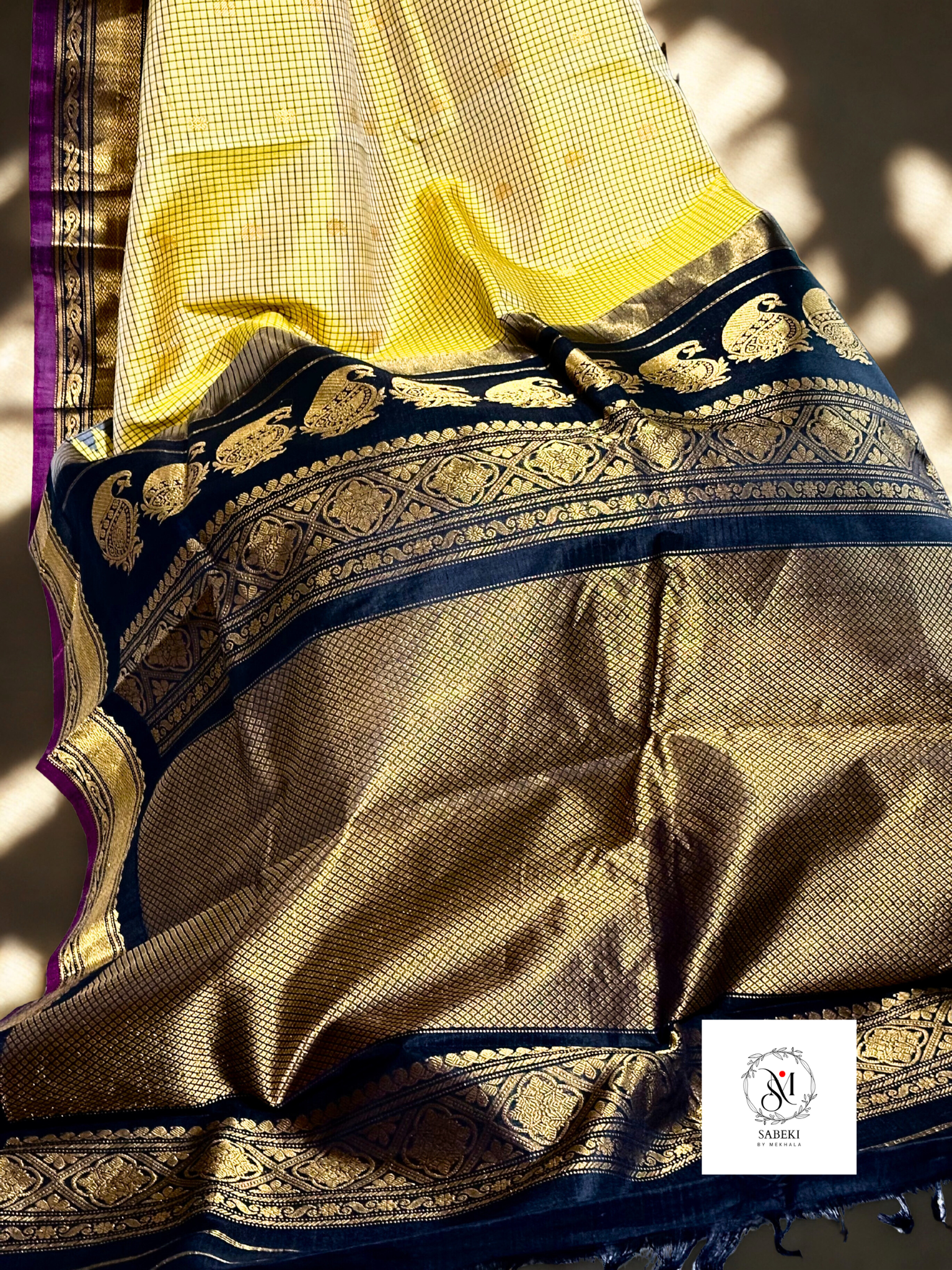 Color: Yellow and Black Checkered pure silk Gadwal