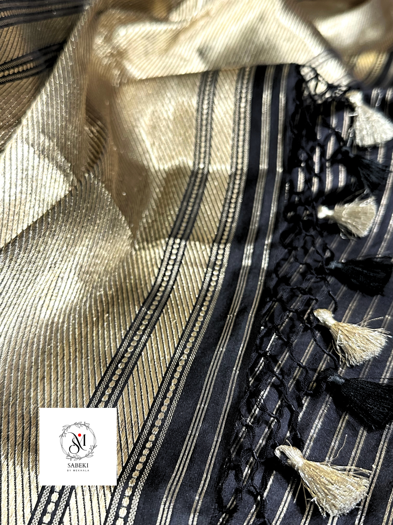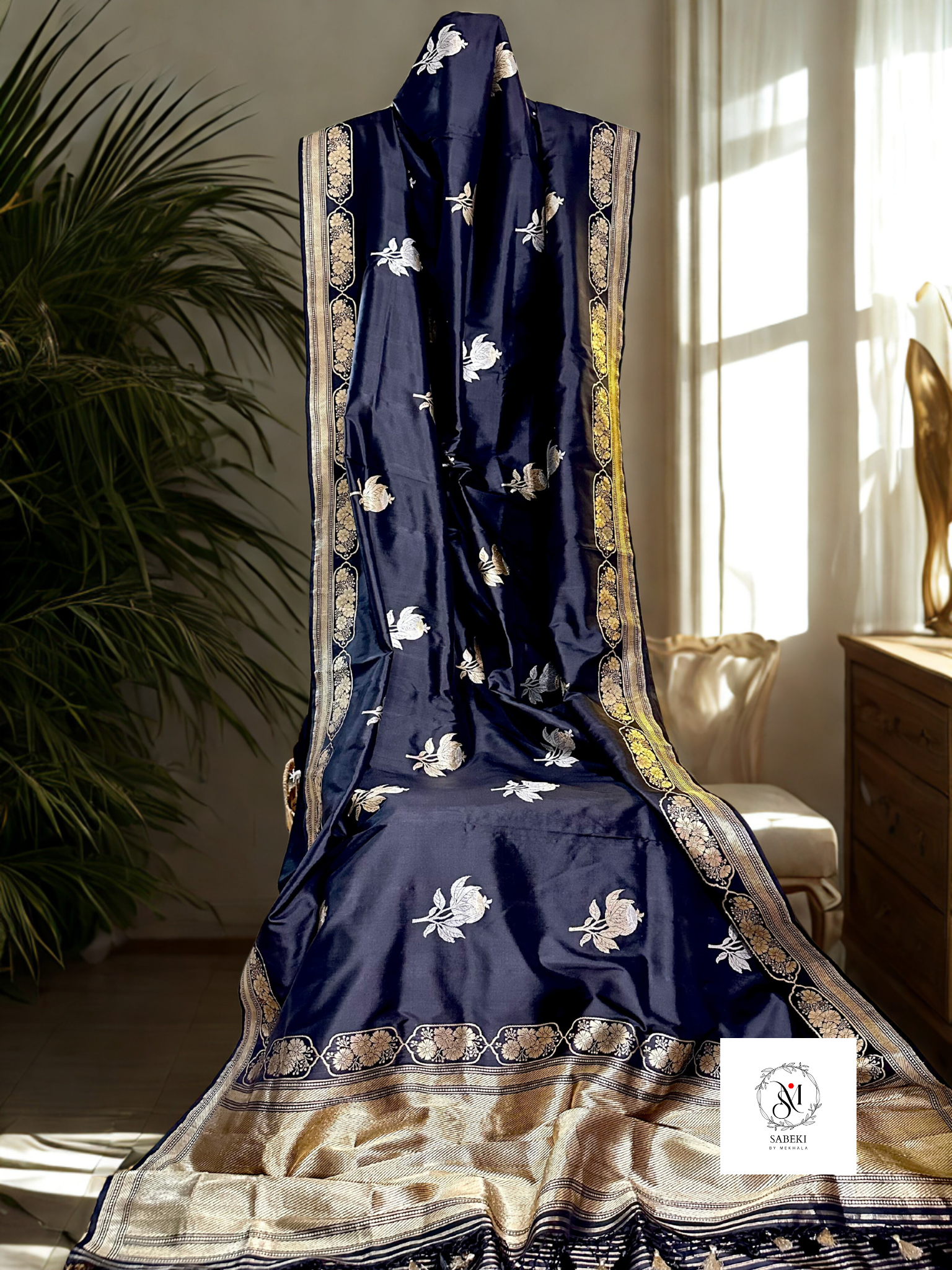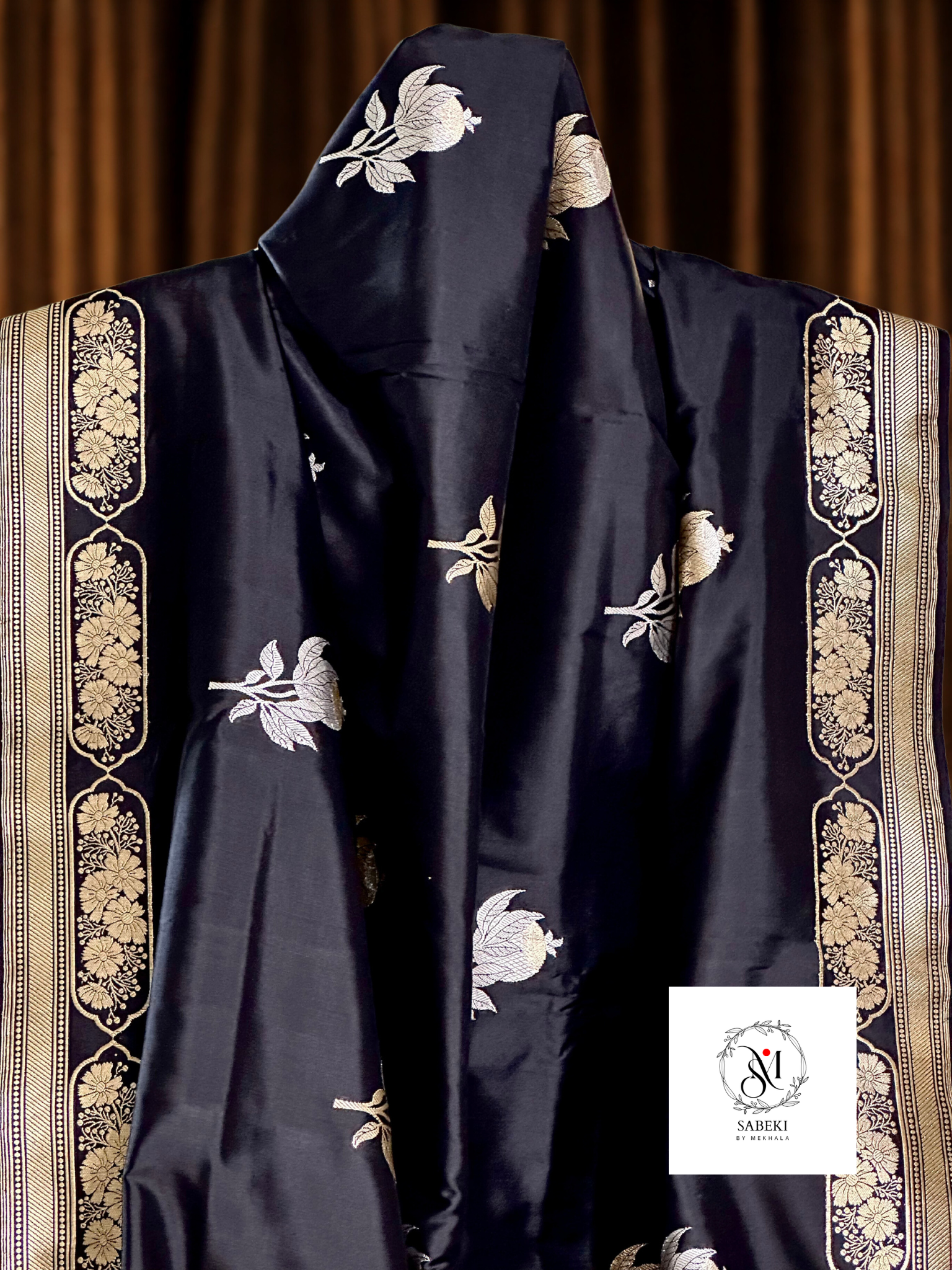 This Bivabori Black-Silver Kaduwa Katan Banarasi captures the exquisite complexity of a starry Banaras night. Crafted from pure Katan, it offers a delicate, feather-like texture, while the Kaduwa motifs and border create a striking, elegant contrast.